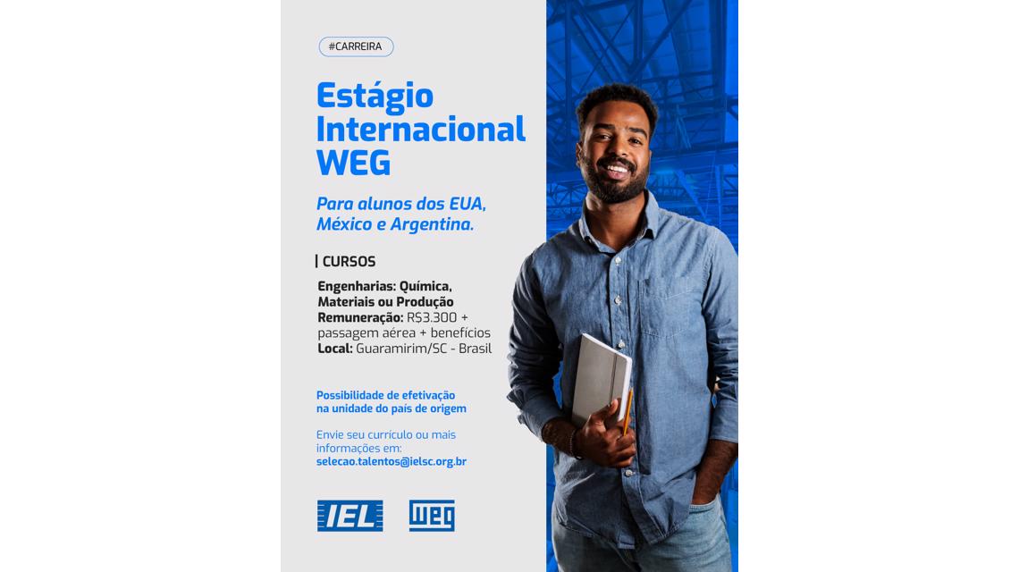 Você, estudante dos EUA, México e Argentina: a WEG, em parceria com o IEL/SC, está com uma oportunidade única de estágio internacional no Brasil para alunos de Engenharia Química, Materiais e Produção.