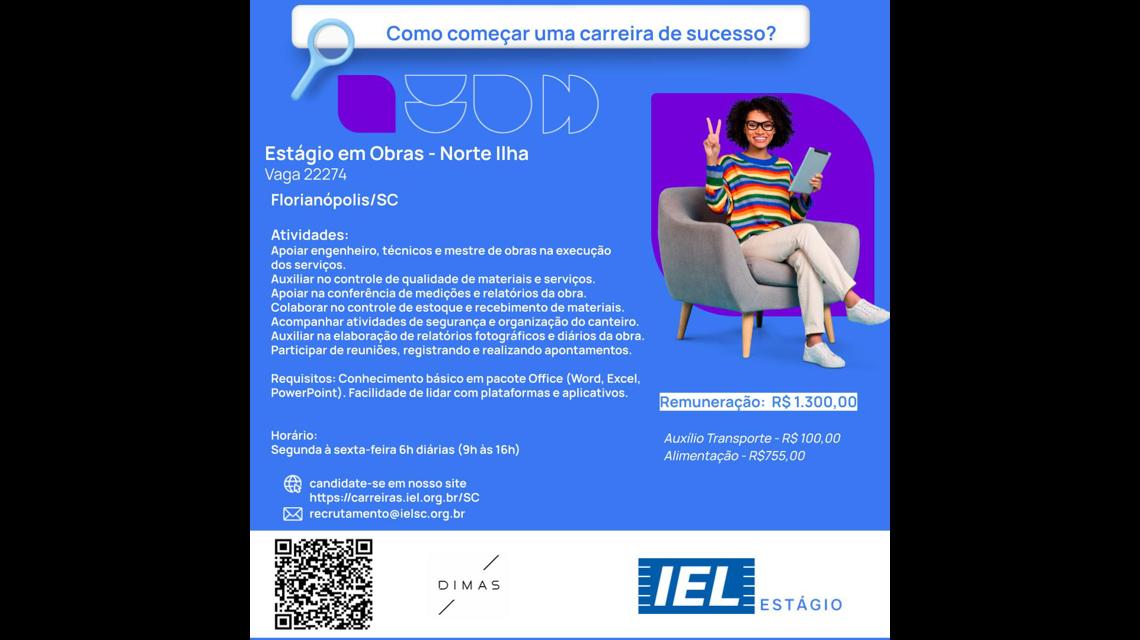 O IEL/SC conecta os melhores profissionais às empresas. Em parceria com a empresa DIMAS, estamos selecionando um estagiário(a) para atuação de Estágio em Obras.
